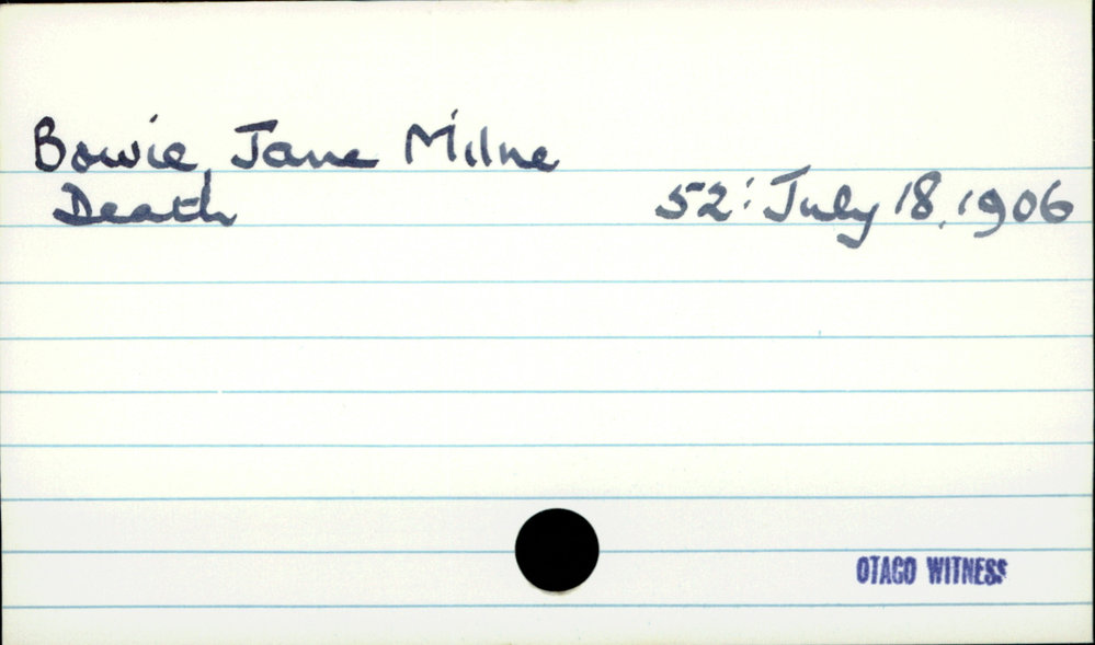 Dunedin Public Libraries (2nd Jan 2019). Bowie, Jane Milne. In Website Dunedin Public Libraries. Retrieved 16th Apr 2026 11:18, from https://dunedin.recollect.co.nz/nodes/view/16529