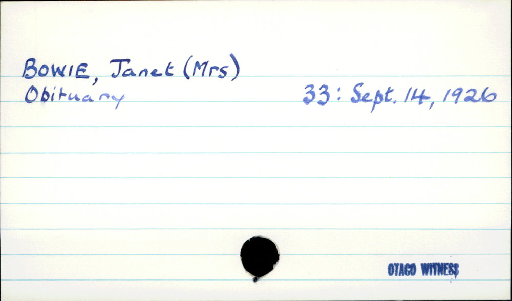 Dunedin Public Libraries (2nd Jan 2019). BOWIE, Janet (Mrs). In Website Dunedin Public Libraries. Retrieved 16th Apr 2026 11:18, from https://dunedin.recollect.co.nz/nodes/view/16530
