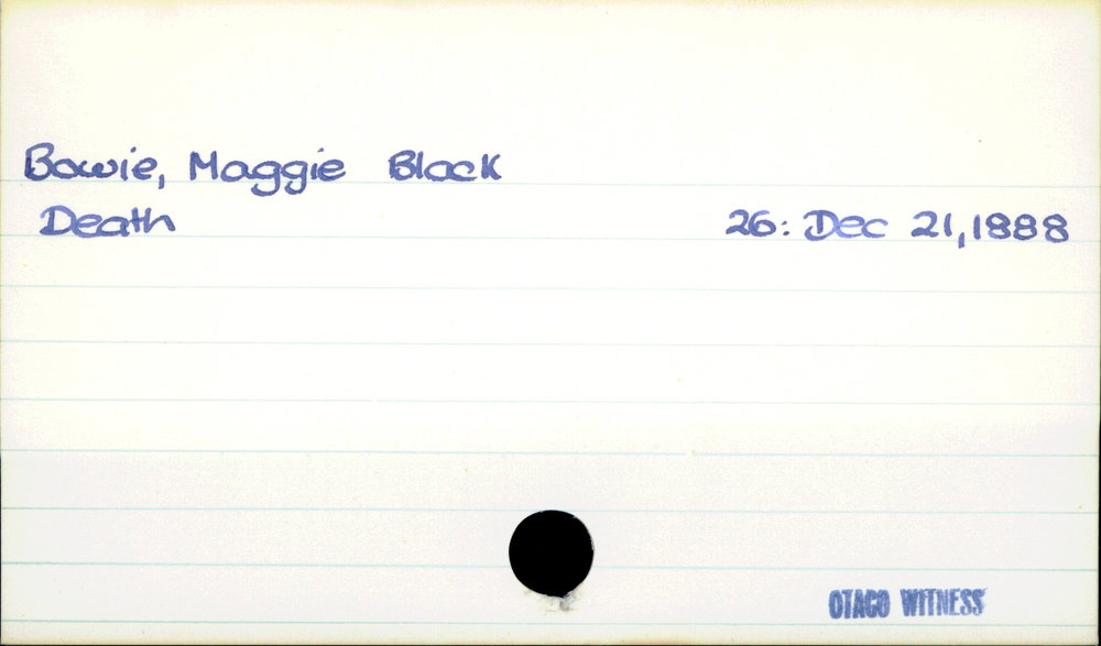 Dunedin Public Libraries (3rd Jan 2019). Bowie, Maggie Black. In Website Dunedin Public Libraries. Retrieved 16th Apr 2026 11:18, from https://dunedin.recollect.co.nz/nodes/view/16532