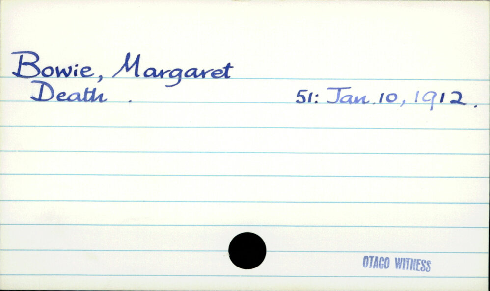 Dunedin Public Libraries (2nd Jan 2019). Bowie, Margaret. In Website Dunedin Public Libraries. Retrieved 16th Apr 2026 11:25, from https://dunedin.recollect.co.nz/nodes/view/16533