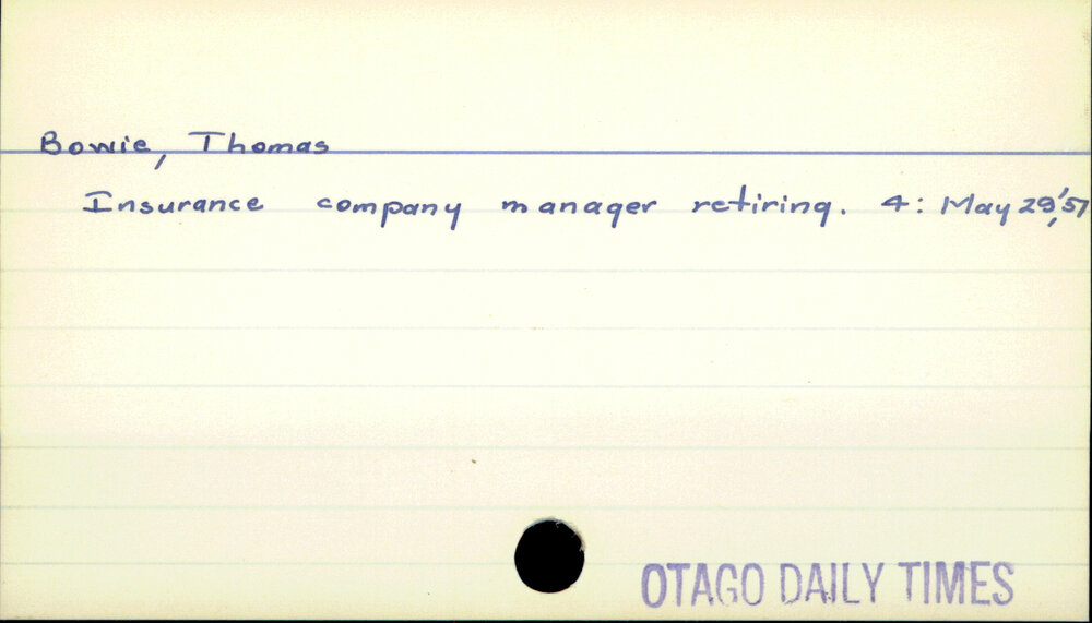 Dunedin Public Libraries (2nd Jan 2019). Bowie, Thomas. In Website Dunedin Public Libraries. Retrieved 16th Apr 2026 11:20, from https://dunedin.recollect.co.nz/nodes/view/16538