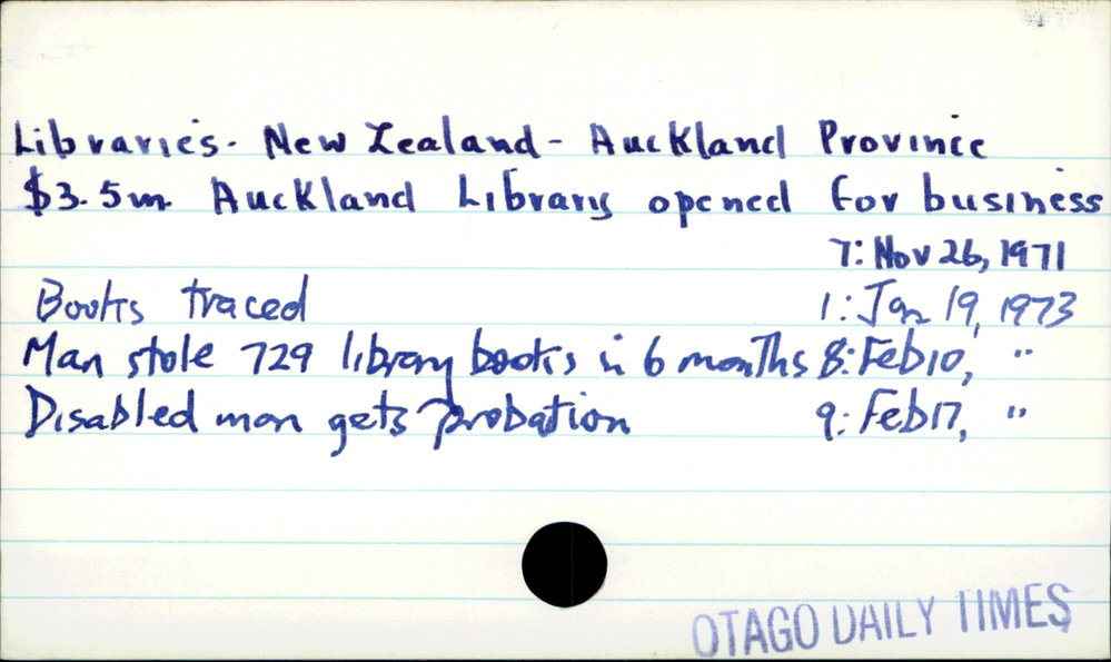 Dunedin Public Libraries (22nd Oct 2020). Libraries - New Zealand - Auckland Province. In Website Dunedin Public Libraries. Retrieved 27th Mar 2026 07:01, from https://dunedin.recollect.co.nz/nodes/view/165416