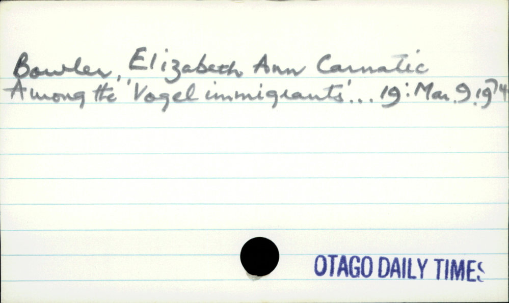 Dunedin Public Libraries (3rd Jan 2019). Bowler, Elizabeth Ann Carnatic. In Website Dunedin Public Libraries. Retrieved 16th Apr 2026 11:18, from https://dunedin.recollect.co.nz/nodes/view/16547