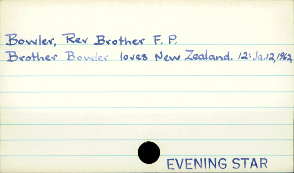 Dunedin Public Libraries (2nd Jan 2019). Bowler, Rev Brother F. P.. In Website Dunedin Public Libraries. Retrieved 16th Apr 2026 11:18, from https://dunedin.recollect.co.nz/nodes/view/16548