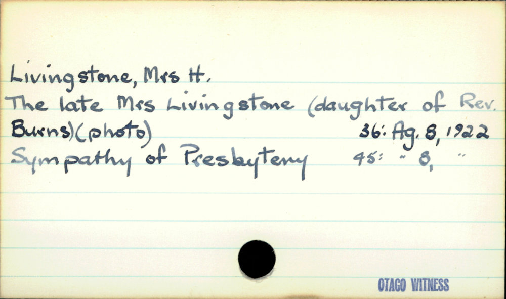 Dunedin Public Libraries (2nd Nov 2020). Livingstone, Mrs H.. In Website Dunedin Public Libraries. Retrieved 27th Mar 2026 07:18, from https://dunedin.recollect.co.nz/nodes/view/166195