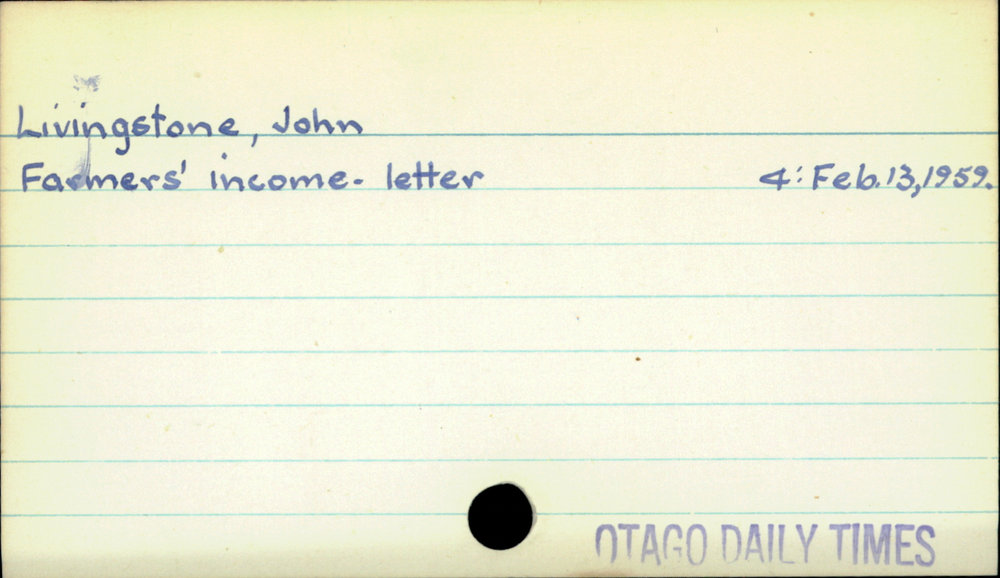 Dunedin Public Libraries (2nd Nov 2020). Livingstone, John. In Website Dunedin Public Libraries. Retrieved 27th Mar 2026 07:10, from https://dunedin.recollect.co.nz/nodes/view/166202