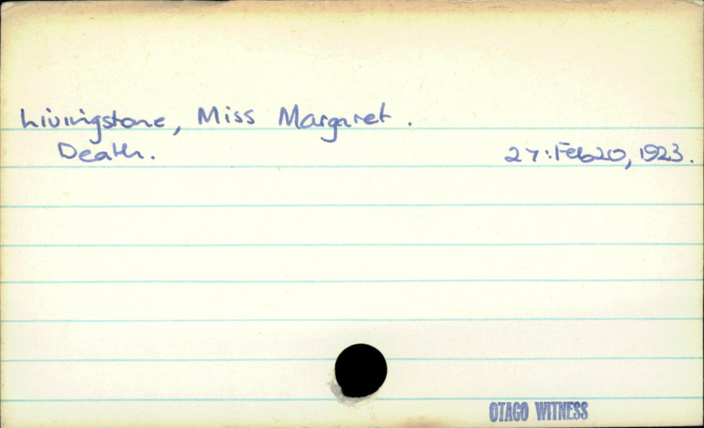 Dunedin Public Libraries (2nd Nov 2020). Livingstone, Miss Margaret. In Website Dunedin Public Libraries. Retrieved 27th Mar 2026 07:10, from https://dunedin.recollect.co.nz/nodes/view/166205