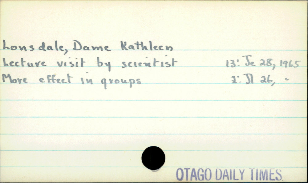 Dunedin Public Libraries (16th Nov 2020). Lonsdale, Dame Kathleen. In Website Dunedin Public Libraries. Retrieved 27th Mar 2026 07:12, from https://dunedin.recollect.co.nz/nodes/view/166970