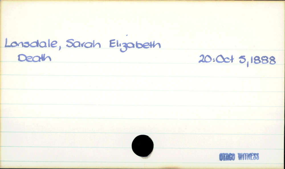 Dunedin Public Libraries (12th Nov 2020). Lonsdale, Sarah Elizabeth. In Website Dunedin Public Libraries. Retrieved 27th Mar 2026 07:18, from https://dunedin.recollect.co.nz/nodes/view/166971