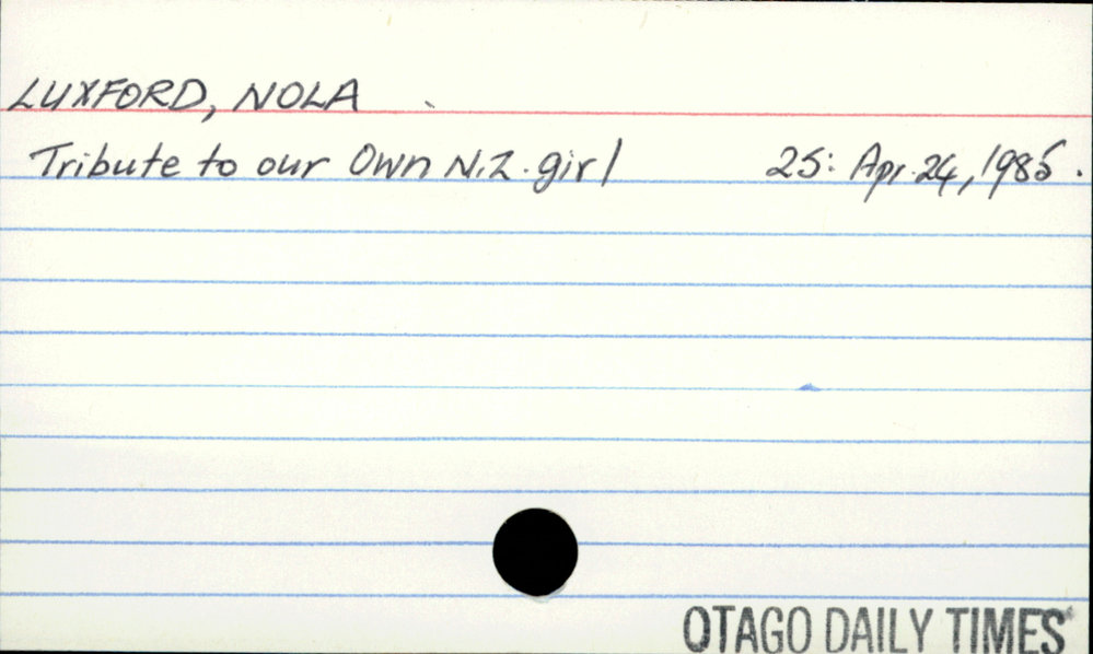 Dunedin Public Libraries (23rd Nov 2020). Luxford, Nola. In Website Dunedin Public Libraries. Retrieved 27th Mar 2026 03:38, from https://dunedin.recollect.co.nz/nodes/view/167750