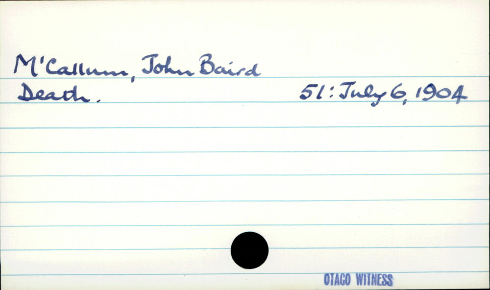 Dunedin Public Libraries (3rd Dec 2020). McCallum, John Baird. In Website Dunedin Public Libraries. Retrieved 27th Mar 2026 03:41, from https://dunedin.recollect.co.nz/nodes/view/168507
