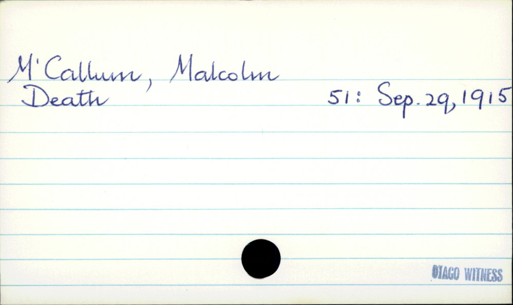Dunedin Public Libraries (3rd Dec 2020). McCallum, Malcolm. In Website Dunedin Public Libraries. Retrieved 27th Mar 2026 03:39, from https://dunedin.recollect.co.nz/nodes/view/168510
