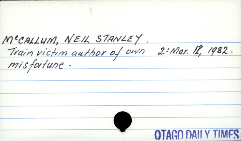 Dunedin Public Libraries (3rd Dec 2020). McCallum, Neil Stanley. In Website Dunedin Public Libraries. Retrieved 27th Mar 2026 03:38, from https://dunedin.recollect.co.nz/nodes/view/168515