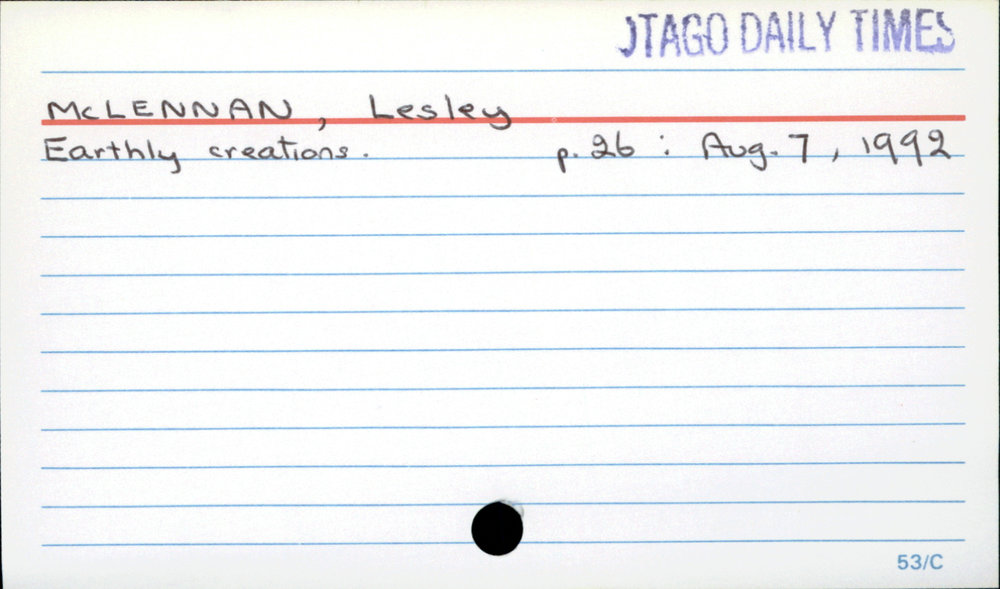 Dunedin Public Libraries (14th Dec 2020). MCLENNAN, Lesley. In Website Dunedin Public Libraries. Retrieved 27th Mar 2026 07:18, from https://dunedin.recollect.co.nz/nodes/view/169286