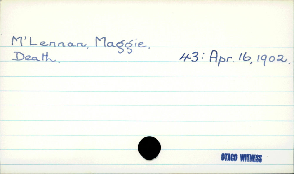 Dunedin Public Libraries (14th Dec 2020). M' Lennan, Maggie. In Website Dunedin Public Libraries. Retrieved 27th Mar 2026 07:13, from https://dunedin.recollect.co.nz/nodes/view/169289