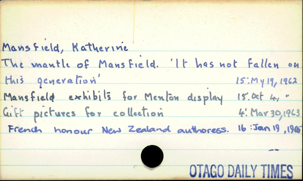 Dunedin Public Libraries (28th Dec 2020). Mansfield, Katherine. In Website Dunedin Public Libraries. Retrieved 27th Mar 2026 03:40, from https://dunedin.recollect.co.nz/nodes/view/170043