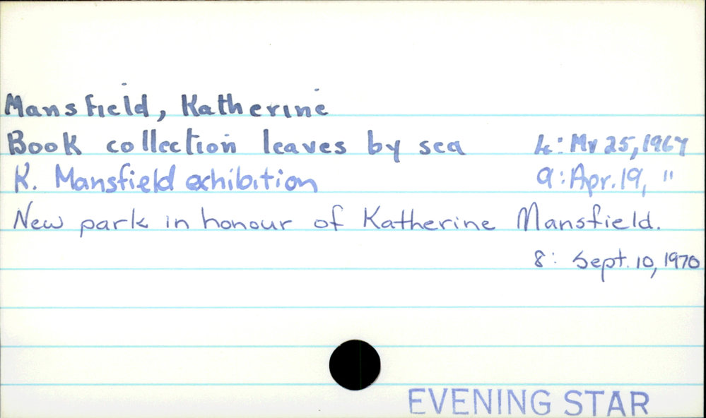 Dunedin Public Libraries (28th Dec 2020). Mansfield, Katherine. In Website Dunedin Public Libraries. Retrieved 27th Mar 2026 03:39, from https://dunedin.recollect.co.nz/nodes/view/170045