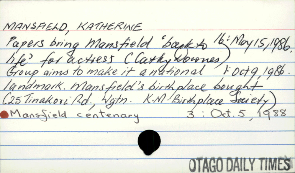 Dunedin Public Libraries (29th Dec 2020). Mansfield, Katherine. In Website Dunedin Public Libraries. Retrieved 27th Mar 2026 03:39, from https://dunedin.recollect.co.nz/nodes/view/170053