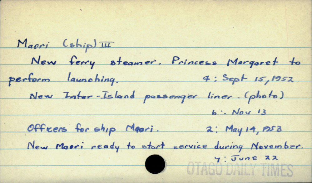 Dunedin Public Libraries (11th Jan 2021). Maori (ship) III. In Website Dunedin Public Libraries. Retrieved 27th Mar 2026 03:39, from https://dunedin.recollect.co.nz/nodes/view/170839