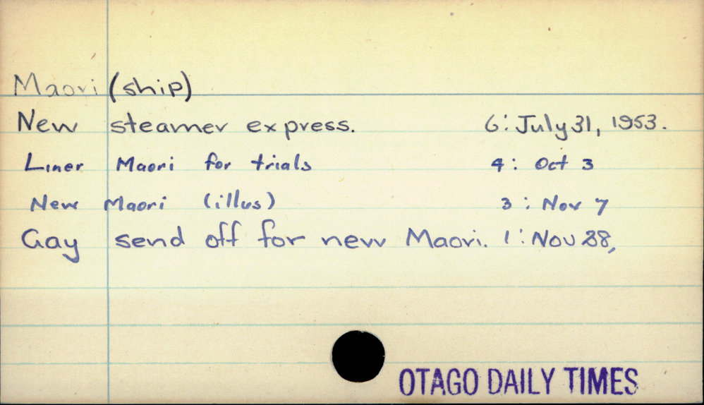 Dunedin Public Libraries (11th Jan 2021). Maori (ship). In Website Dunedin Public Libraries. Retrieved 27th Mar 2026 03:38, from https://dunedin.recollect.co.nz/nodes/view/170840