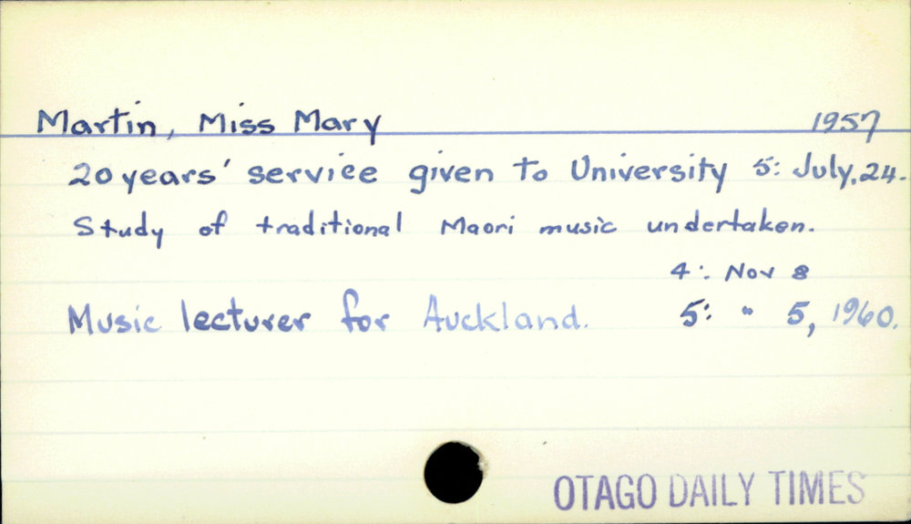 Dunedin Public Libraries (21st Jan 2021). Martin, Miss Mary. In Website Dunedin Public Libraries. Retrieved 27th Mar 2026 03:39, from https://dunedin.recollect.co.nz/nodes/view/171699
