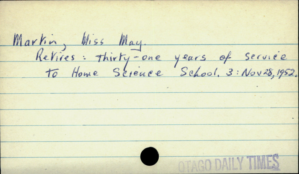 Dunedin Public Libraries (21st Jan 2021). Martin, Miss May. In Website Dunedin Public Libraries. Retrieved 27th Mar 2026 03:41, from https://dunedin.recollect.co.nz/nodes/view/171709