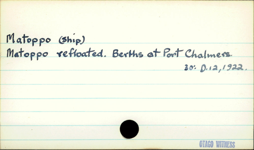 Dunedin Public Libraries (29th Jan 2021). Matoppo(Ship). In Website Dunedin Public Libraries. Retrieved 27th Mar 2026 03:40, from https://dunedin.recollect.co.nz/nodes/view/172504