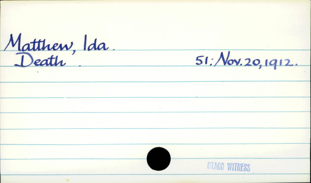Dunedin Public Libraries (30th Jan 2021). Matthew, Ida. In Website Dunedin Public Libraries. Retrieved 27th Mar 2026 03:40, from https://dunedin.recollect.co.nz/nodes/view/172516