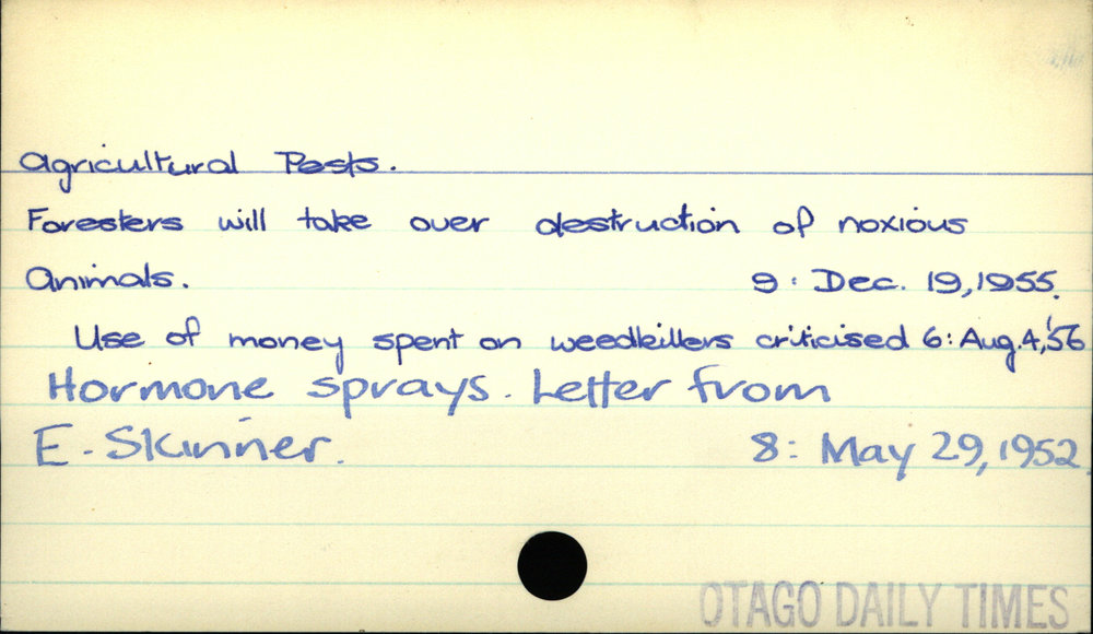 Dunedin Public Libraries (27th May 2018). Agricultural Pests. In Website Dunedin Public Libraries. Retrieved 27th Mar 2026 14:15, from https://dunedin.recollect.co.nz/nodes/view/1735