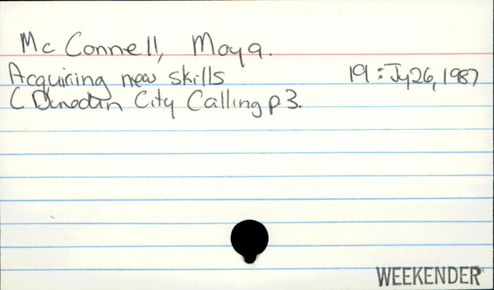 Dunedin Public Libraries (19th Feb 2021). McConnell, Moya. In Website Dunedin Public Libraries. Retrieved 27th Mar 2026 02:07, from https://dunedin.recollect.co.nz/nodes/view/173658