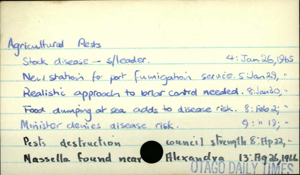 Dunedin Public Libraries (26th May 2018). Agricultural Pests. In Website Dunedin Public Libraries. Retrieved 27th Mar 2026 14:15, from https://dunedin.recollect.co.nz/nodes/view/1741