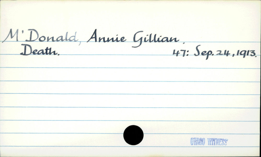 Dunedin Public Libraries (25th Feb 2021). MacDonald, Annie Gillian. In Website Dunedin Public Libraries. Retrieved 27th Mar 2026 03:38, from https://dunedin.recollect.co.nz/nodes/view/174111