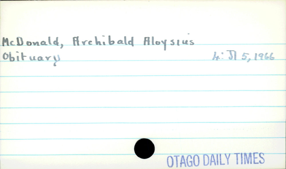 Dunedin Public Libraries (25th Feb 2021). McDonald, Archibald Aloysius. In Website Dunedin Public Libraries. Retrieved 27th Mar 2026 03:38, from https://dunedin.recollect.co.nz/nodes/view/174116