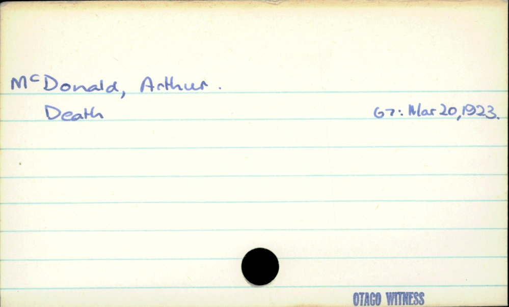 Dunedin Public Libraries (25th Feb 2021). McDonald, Arthur. In Website Dunedin Public Libraries. Retrieved 27th Mar 2026 03:39, from https://dunedin.recollect.co.nz/nodes/view/174118
