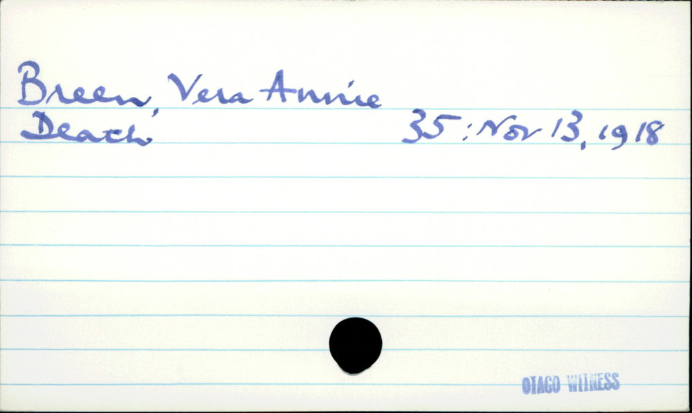 Dunedin Public Libraries (10th Jan 2019). Breen, Vera Annie. In Website Dunedin Public Libraries. Retrieved 2nd Apr 2026 17:56, from https://dunedin.recollect.co.nz/nodes/view/17433