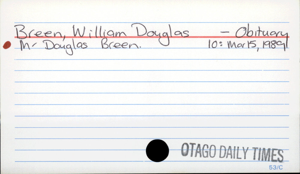 Dunedin Public Libraries (10th Jan 2019). Breen, William Douglas. In Website Dunedin Public Libraries. Retrieved 2nd Apr 2026 17:45, from https://dunedin.recollect.co.nz/nodes/view/17434