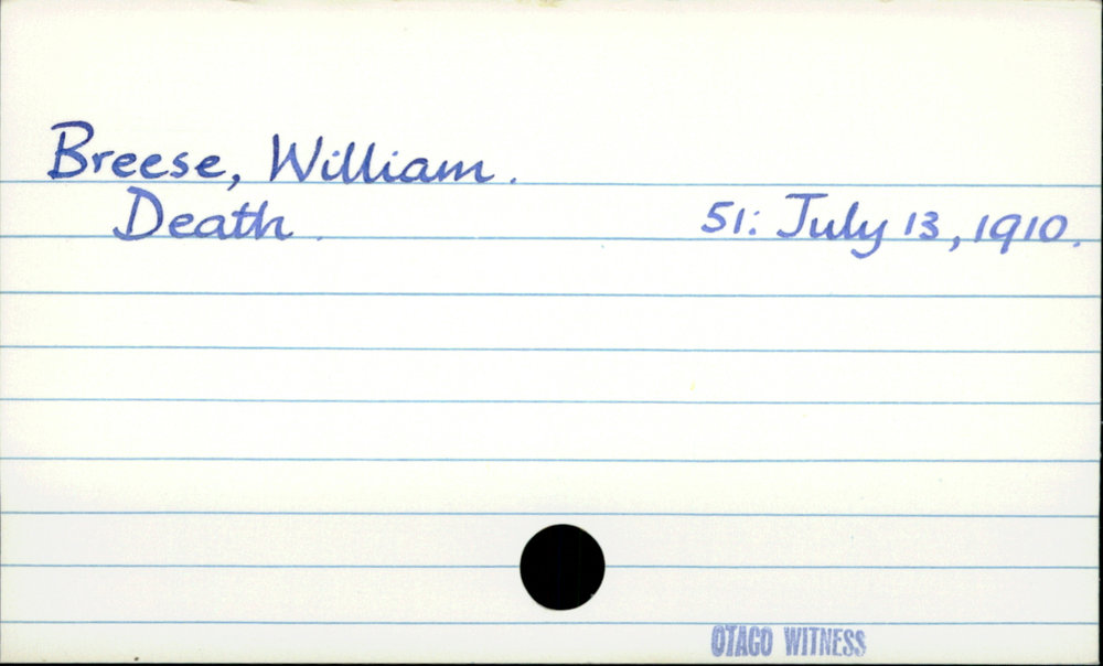 Dunedin Public Libraries (10th Jan 2019). Breese, William. In Website Dunedin Public Libraries. Retrieved 2nd Apr 2026 17:56, from https://dunedin.recollect.co.nz/nodes/view/17439
