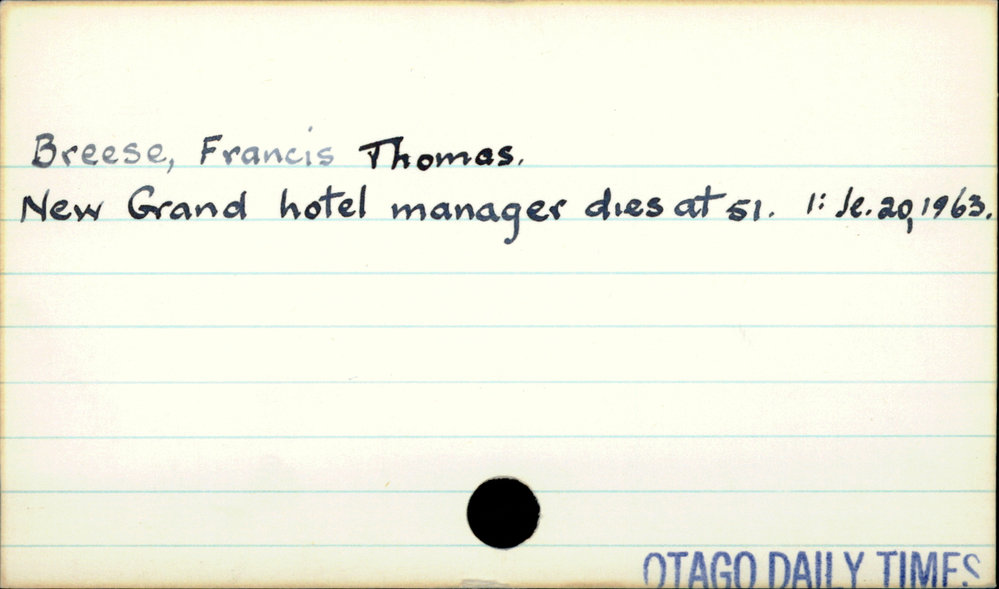 Dunedin Public Libraries (10th Jan 2019). Breese, Francis Thomas . In Website Dunedin Public Libraries. Retrieved 2nd Apr 2026 17:45, from https://dunedin.recollect.co.nz/nodes/view/17442