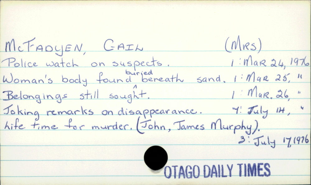 Dunedin Public Libraries (6th Mar 2021). McFADYEN, GAIL (MRS). In Website Dunedin Public Libraries. Retrieved 27th Mar 2026 03:39, from https://dunedin.recollect.co.nz/nodes/view/174898