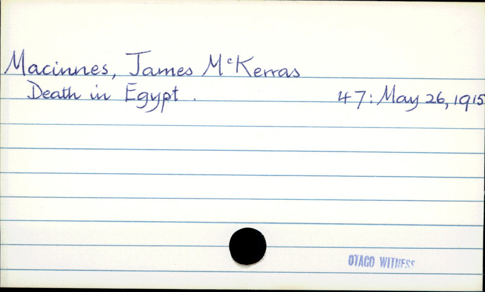 Dunedin Public Libraries (16th Mar 2021). Macinnes, James McKerras. In Website Dunedin Public Libraries. Retrieved 27th Mar 2026 03:41, from https://dunedin.recollect.co.nz/nodes/view/175714