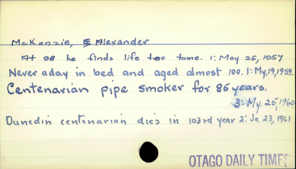 Dunedin Public Libraries (29th Mar 2021). McKenzie, Alexander. In Website Dunedin Public Libraries. Retrieved 27th Mar 2026 03:39, from https://dunedin.recollect.co.nz/nodes/view/176511