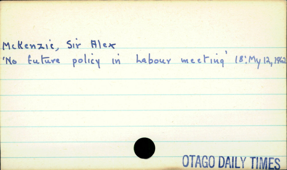 Dunedin Public Libraries (25th Mar 2021). McKenzie, Sir Alex. In Website Dunedin Public Libraries. Retrieved 27th Mar 2026 03:39, from https://dunedin.recollect.co.nz/nodes/view/176514