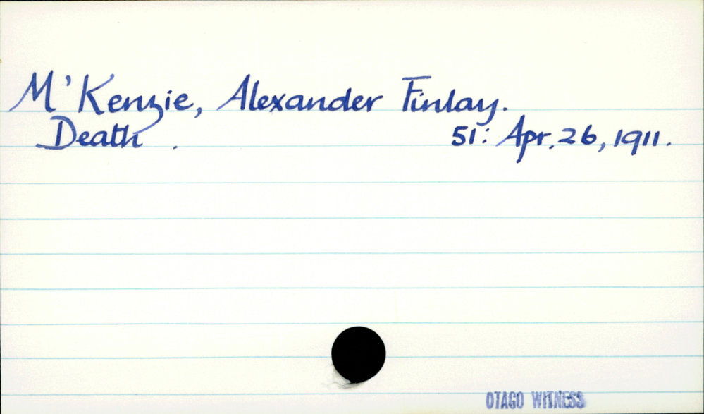 Dunedin Public Libraries (25th Mar 2021). M'Kenzie, Alexander Finlay. In Website Dunedin Public Libraries. Retrieved 27th Mar 2026 03:39, from https://dunedin.recollect.co.nz/nodes/view/176516