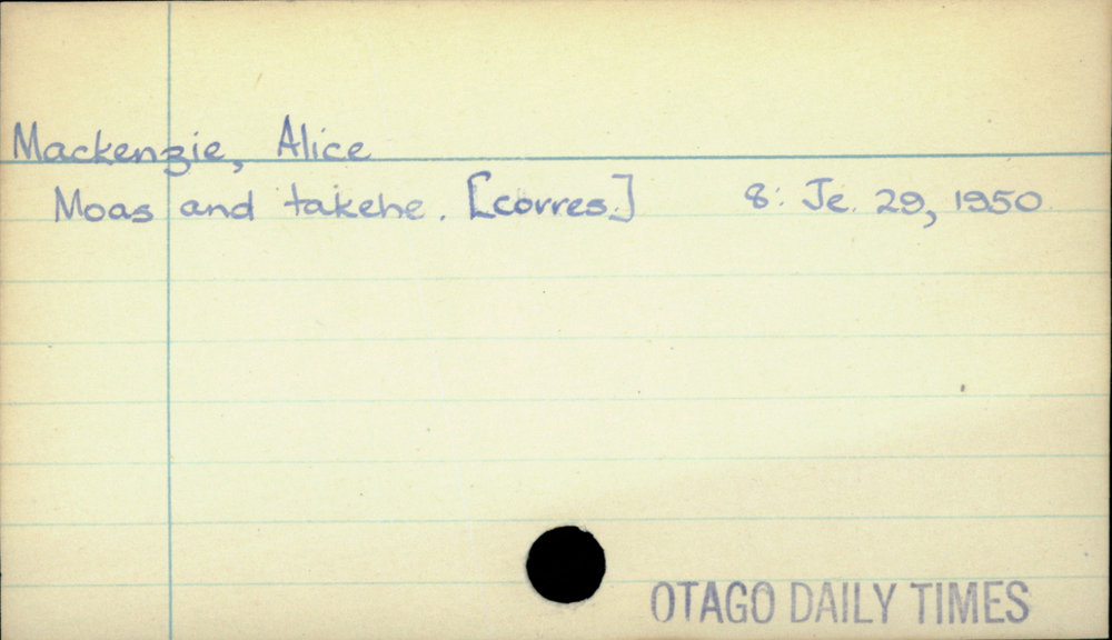 Dunedin Public Libraries (29th Mar 2021). Mackenzie, Alice. In Website Dunedin Public Libraries. Retrieved 27th Mar 2026 03:39, from https://dunedin.recollect.co.nz/nodes/view/176519