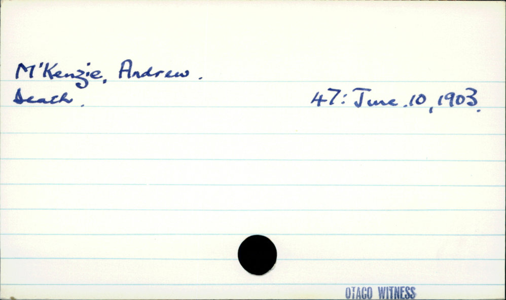 Dunedin Public Libraries (25th Mar 2021). M'Kenzie, Andrew. In Website Dunedin Public Libraries. Retrieved 27th Mar 2026 03:38, from https://dunedin.recollect.co.nz/nodes/view/176522