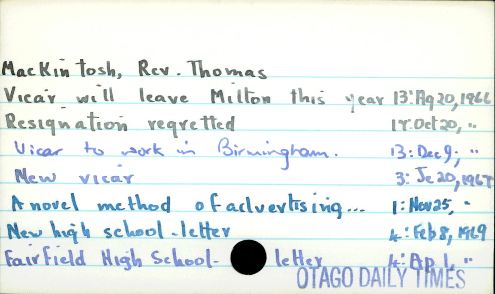 Dunedin Public Libraries (2nd Apr 2021). Mackintosh, Rev Thomas. In Website Dunedin Public Libraries. Retrieved 27th Mar 2026 03:39, from https://dunedin.recollect.co.nz/nodes/view/177290