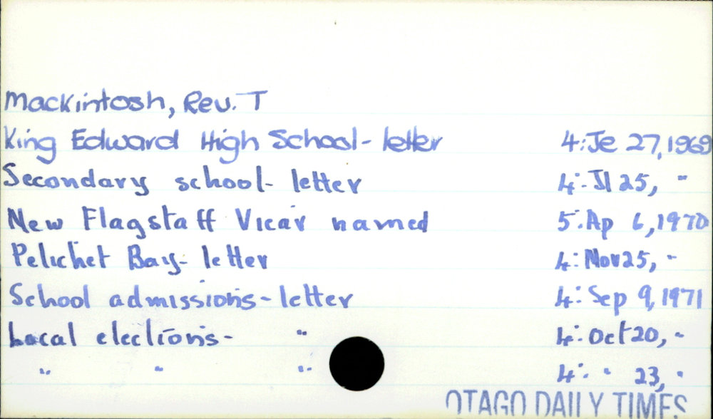 Dunedin Public Libraries (2nd Apr 2021). MacKintosh, Rev. T. In Website Dunedin Public Libraries. Retrieved 27th Mar 2026 03:39, from https://dunedin.recollect.co.nz/nodes/view/177293