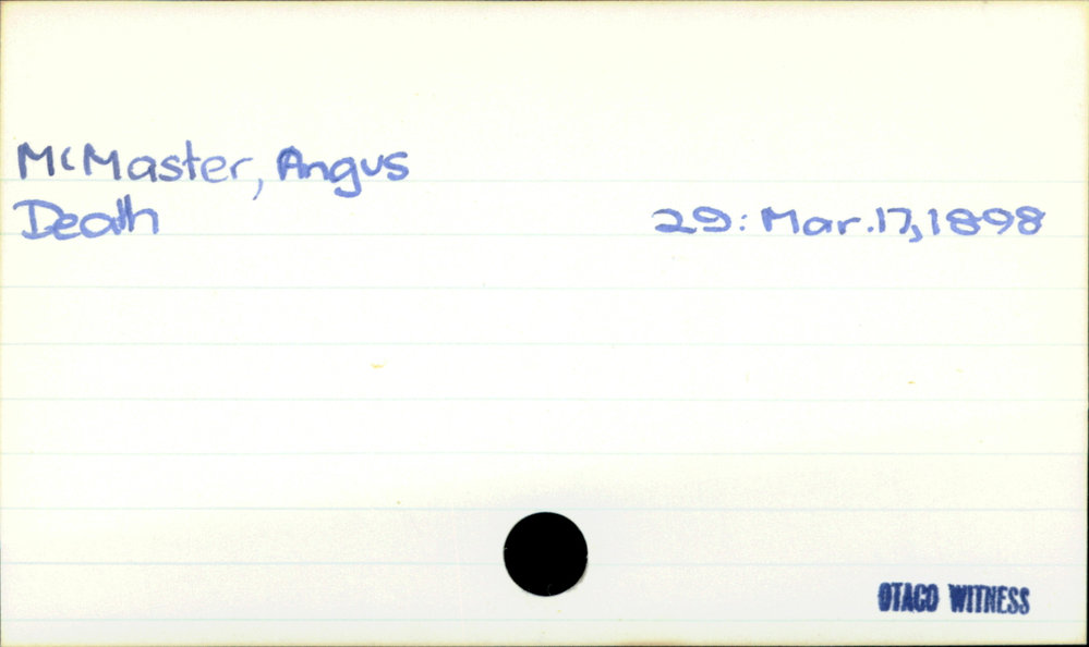 Dunedin Public Libraries (6th Apr 2021). McMaster, Angus. In Website Dunedin Public Libraries. Retrieved 27th Mar 2026 02:06, from https://dunedin.recollect.co.nz/nodes/view/177618