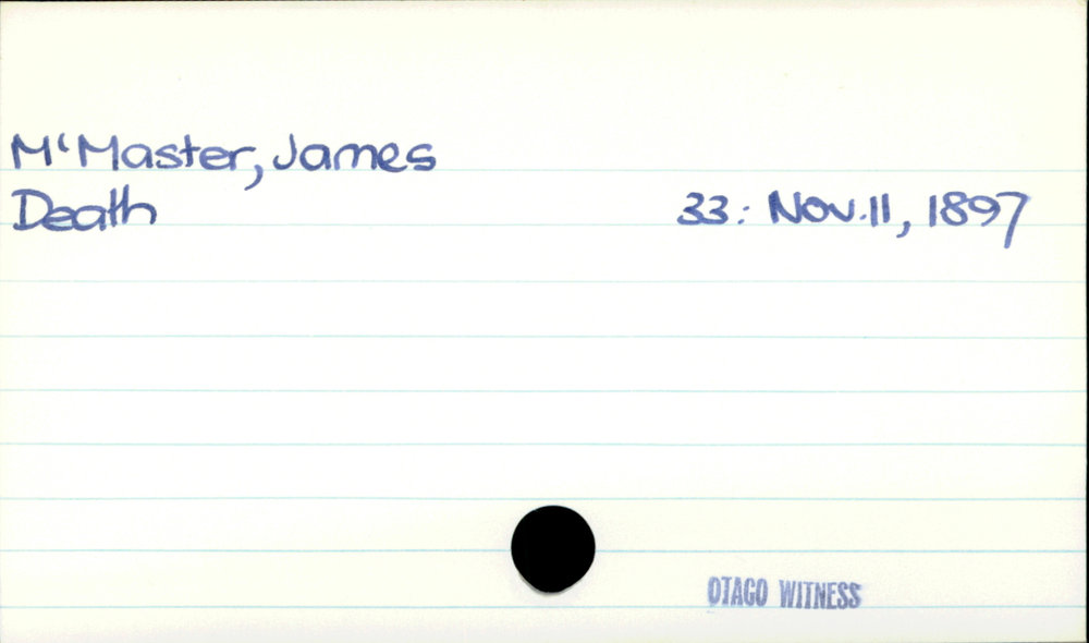 Dunedin Public Libraries (6th Apr 2021). McMaster, James. In Website Dunedin Public Libraries. Retrieved 27th Mar 2026 02:14, from https://dunedin.recollect.co.nz/nodes/view/177628
