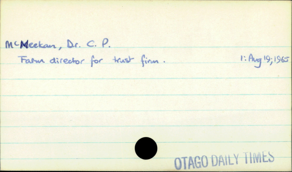 Dunedin Public Libraries (6th Apr 2021). McMeekan, Dr. C.P.. In Website Dunedin Public Libraries. Retrieved 27th Mar 2026 00:24, from https://dunedin.recollect.co.nz/nodes/view/177652
